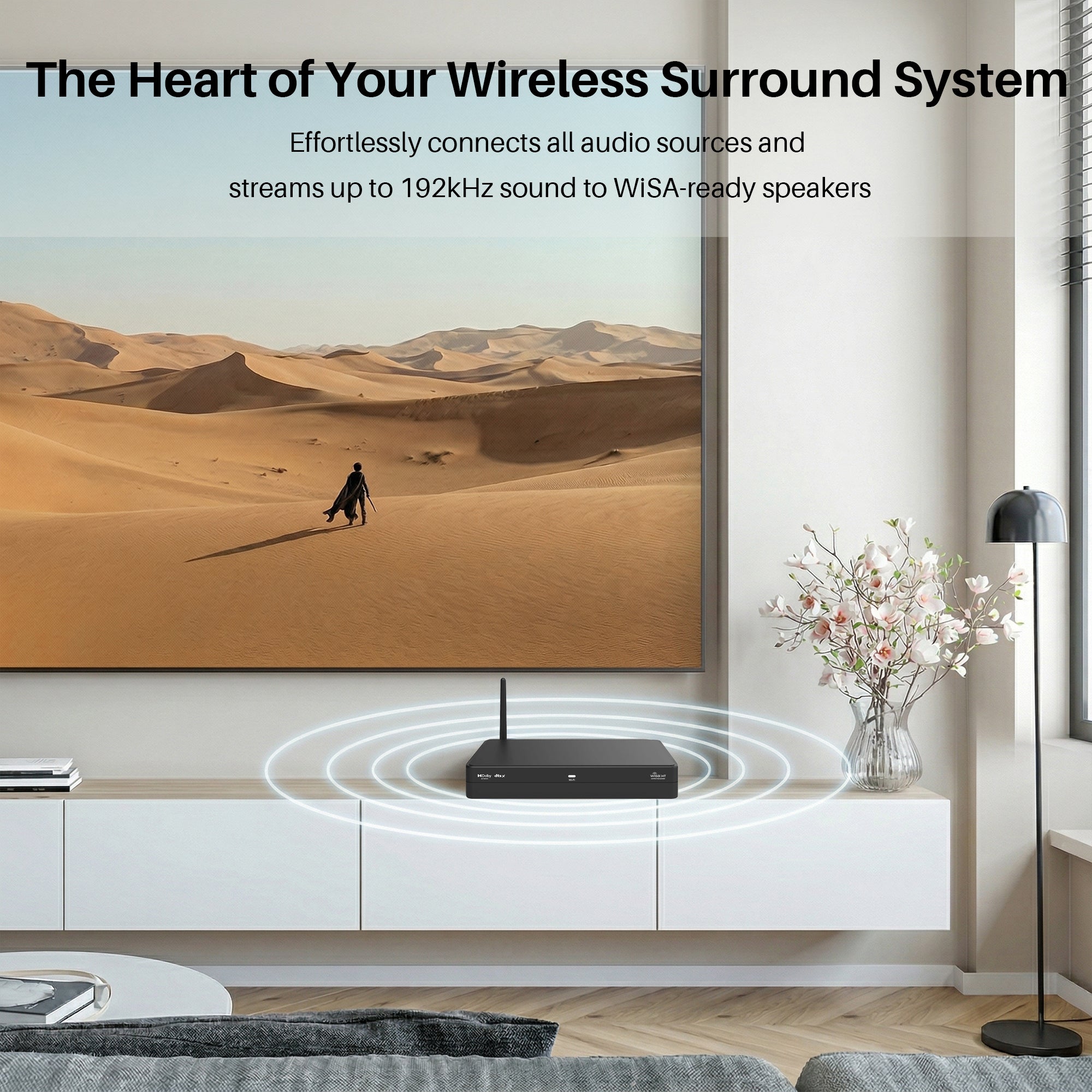 WiSA HT Surround Hub / Surround Hub X ist ein digitales, verlustfreies Surround-System mit allem, was Sie von einem herkömmlichen AV-Receiver erwarten. Es enthält HDMI-Umschaltung, Dekodierung, Streaming und verschiedene Audioeingänge. Es wird mit einer 2-Wege-RF-Smart-Fernbedienung mit voller Kontrolle und Rückmeldung geliefert, sodass Sie den Surround Hub verstecken können. Es fungiert als Brücke zwischen den meisten Audioquellen und WiSA HT-fähigen Lautsprechern für die Wiedergabe.