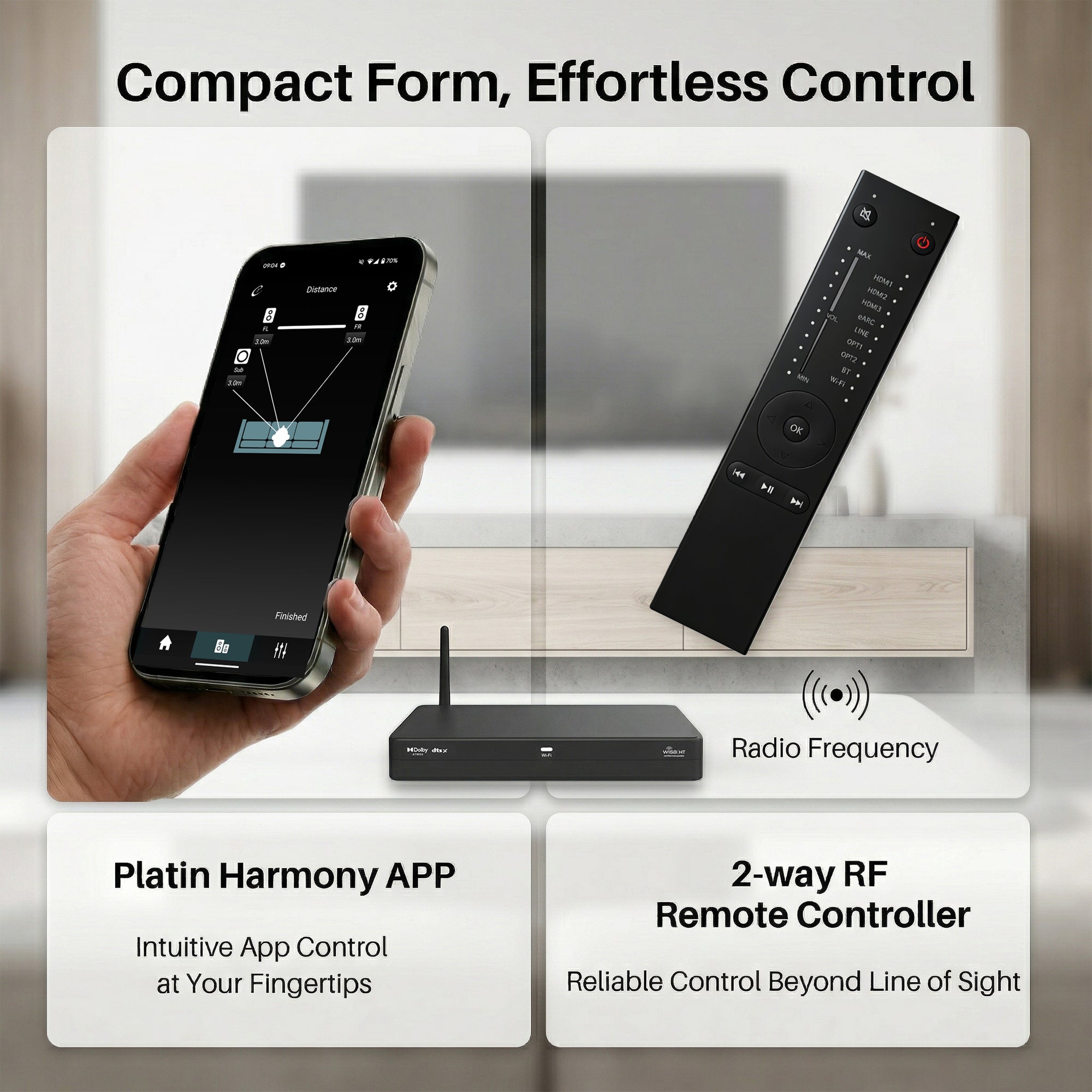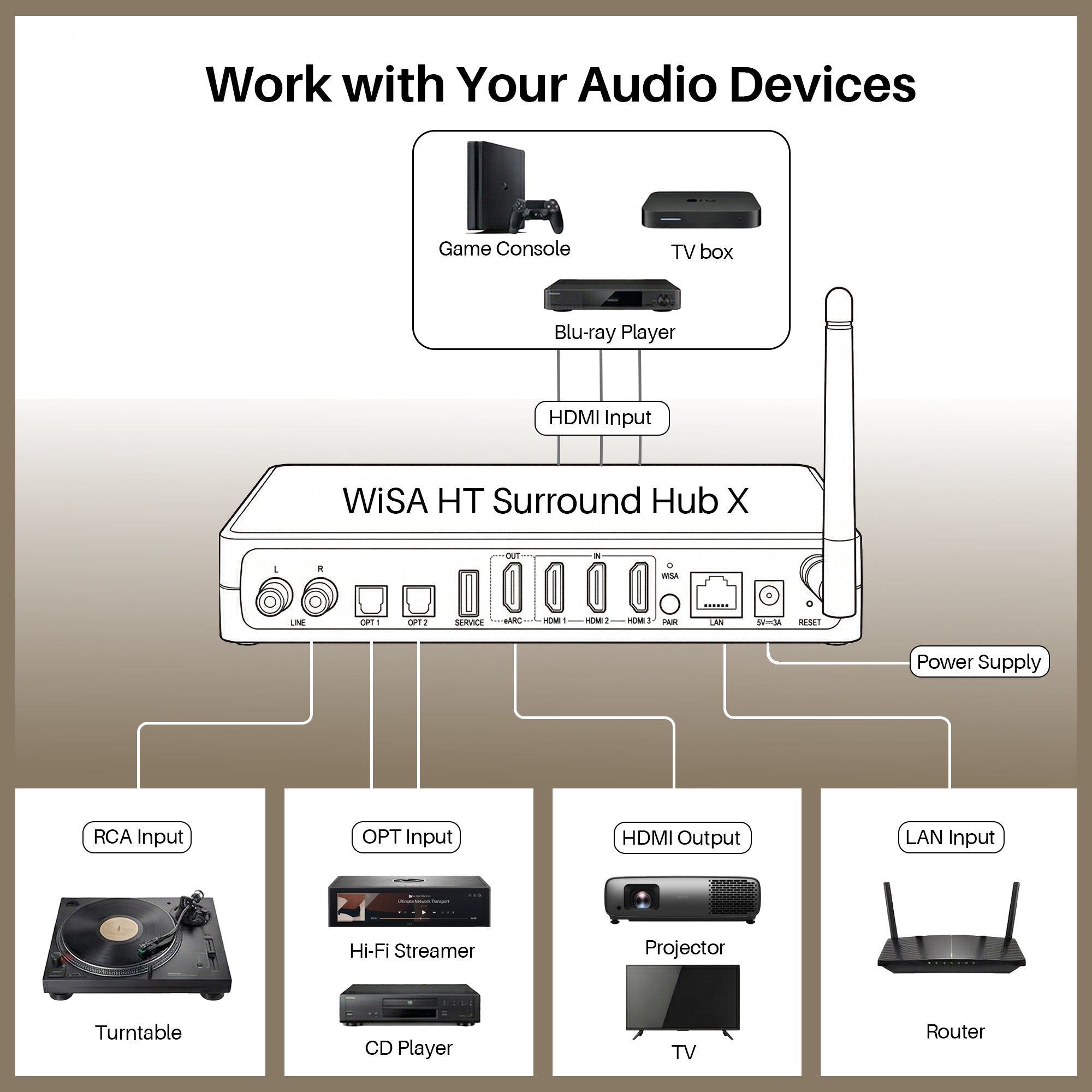 WiSA Surround Hub / Surround Hub X will connect with any WiSA HT certified speaker on the market - and when combined with our advanced Platin Harmony APP, you unlock a whole new world of features for this device. The APP also allows you to do streaming playback-control and album art showing. You can adjust volume and change the input of the device. It also allows you free access to the DSP-core of the WiSA Surround Hub.